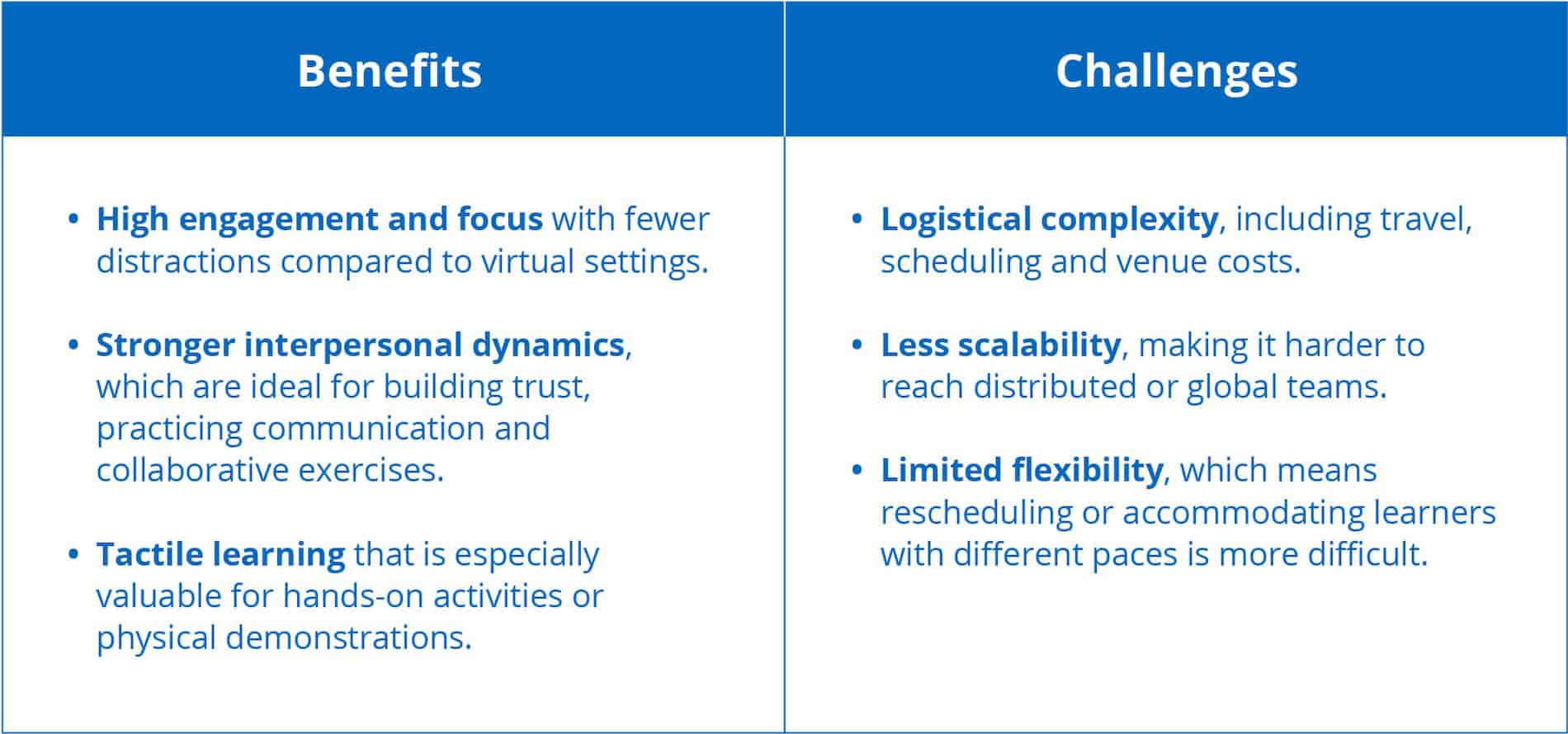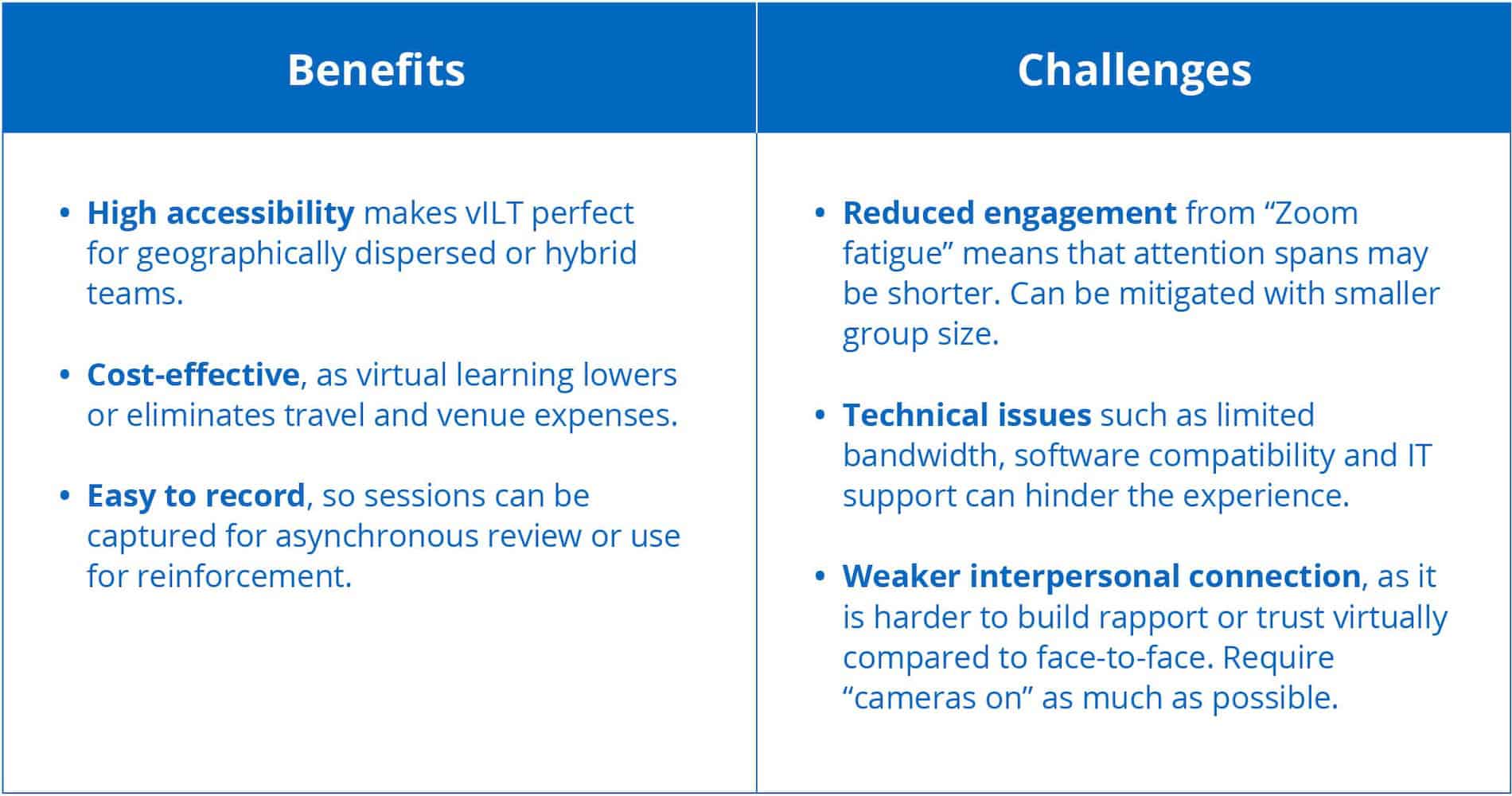 While ILT is highly effective, it’s important to understand its limitations. That way, your team can align your training strategies with the organizational realities.