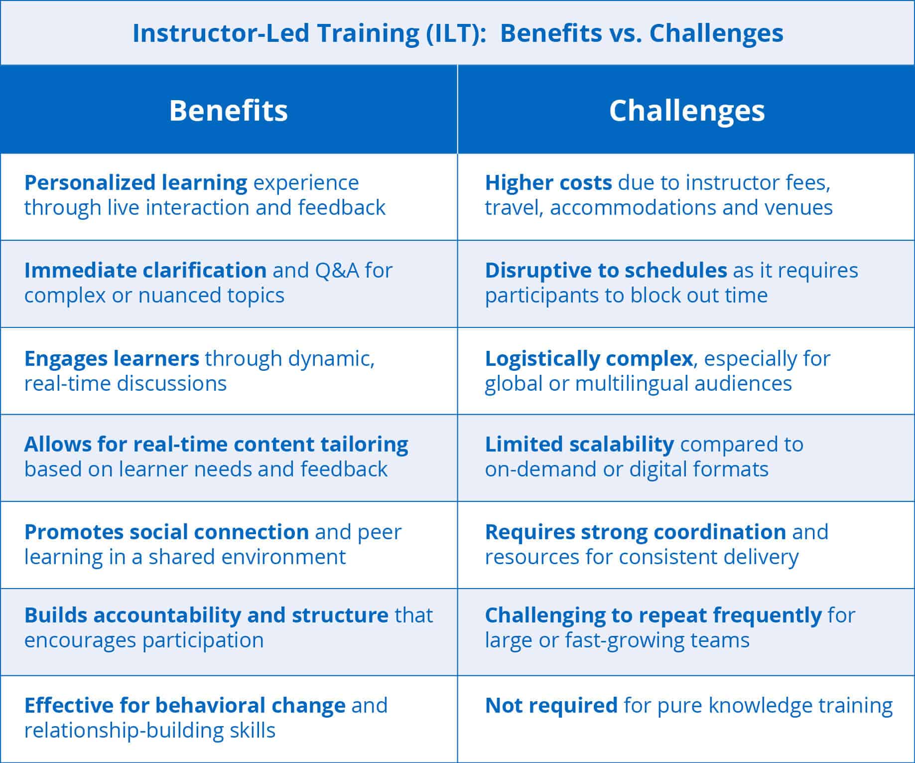 When it matters: Organizations experiencing rapid growth or high turnover may struggle to keep up with demand using ILT alone, making a blended approach more viable.